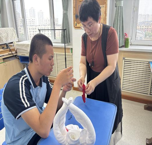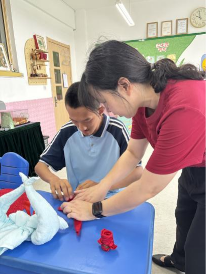 在另一实践区域,赵丹与王晓欢老师以“红心向党,玫瑰传情” 为主题开展毛巾折花教学。两位老师通过分步拆解折叠、卷曲、定型等技巧,将普通毛巾幻化为栩栩如生的立体玫瑰花,并在花蕊处点缀红色绸带,寓意红心向党。在两位老师的悉心指导下,员工们反复调整毛巾褶皱,最终创作出饱含深情的 “玫瑰” 作品,在实践中提升动手能力的同时,深化了对红色精神的理解。