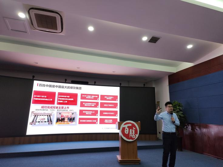 王子木经理详细介绍了百胜中国的发展历程、辽吉市场概况、企业文化、管理菁英班人才培养模式、养成计划、课程等内容。