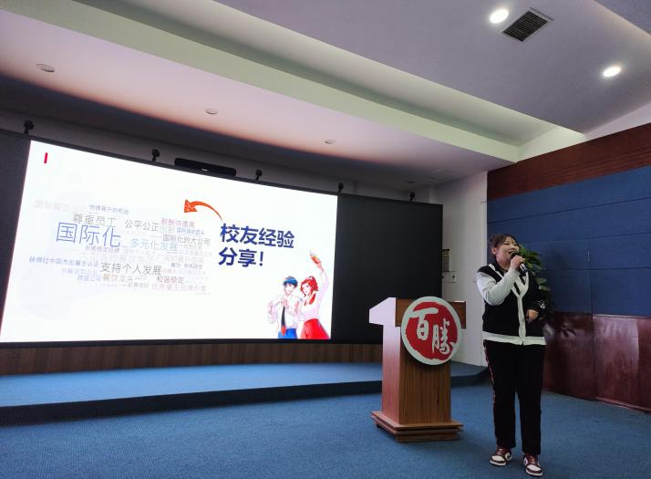唐钰经理致辞,她肯定了订单班对企业人才培养的重大意义,并强调后续将加强加大校企双方的合作力度及广度,以期在更多方面与公司有更多的合作。