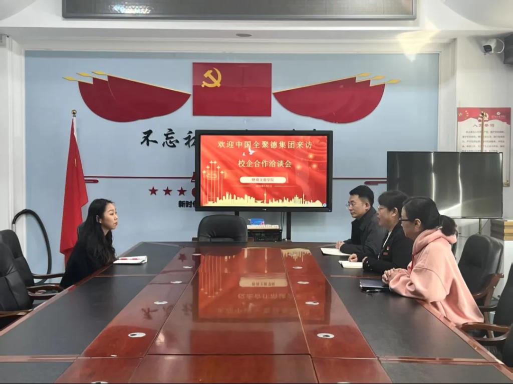 3月5日,中华老字号全聚德集团人力资源部校招经理石妍来到公司,就校企合作事宜进行深入洽谈。经理赵美玲、副经理于小溪、副书记王薪潭参与校企合作洽谈会。未来,双方将共同制定人才培养方案,为员工提供实习就业机会,并邀请全聚德集团资深技师来校做专题校招宣讲会。